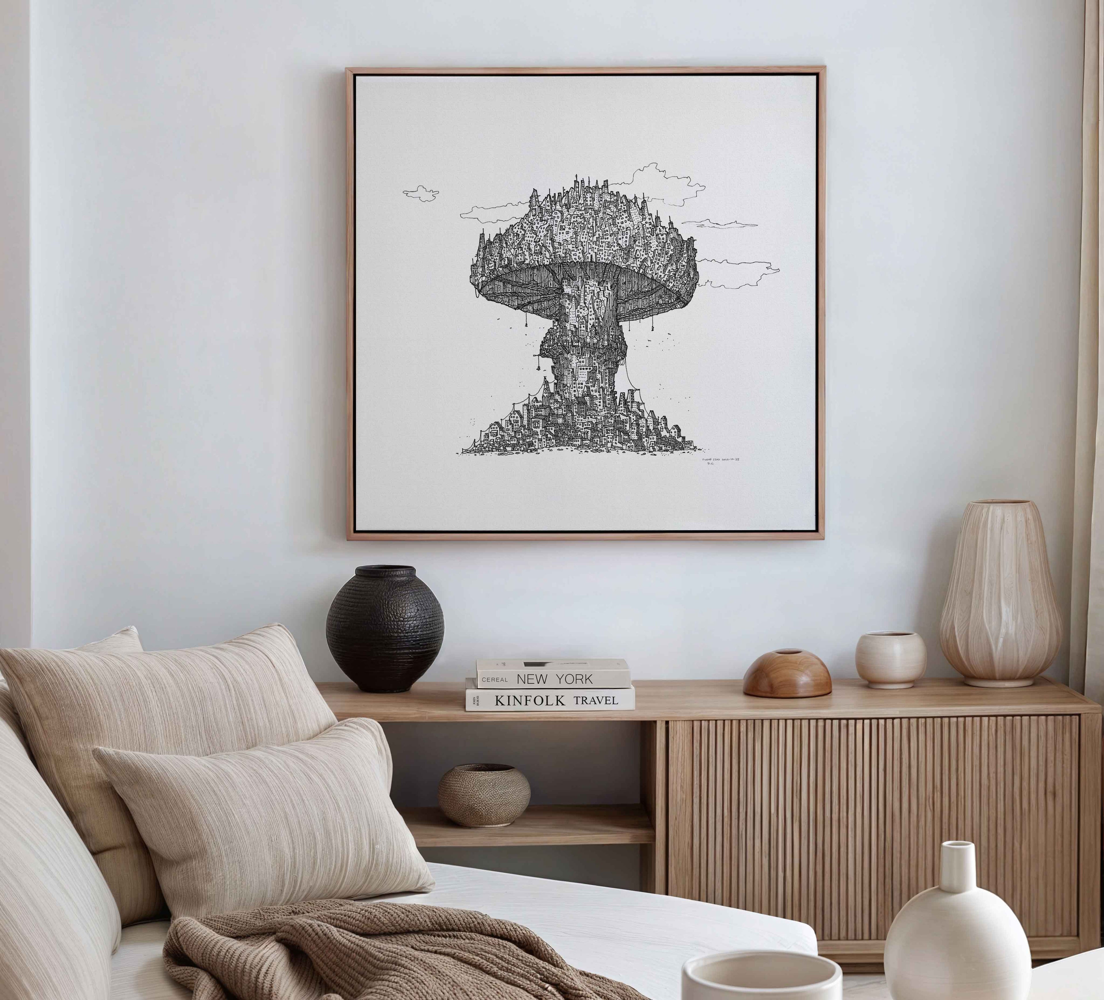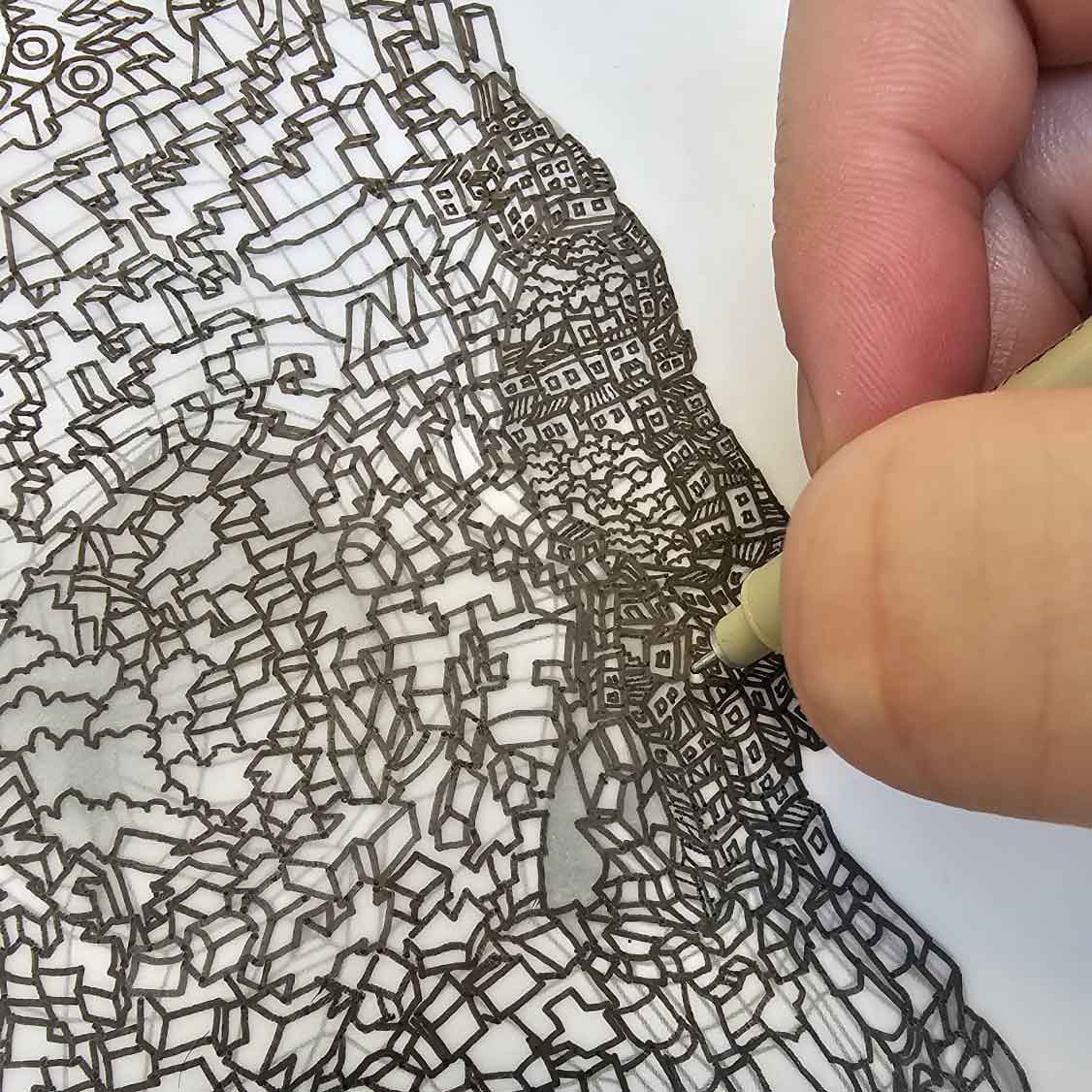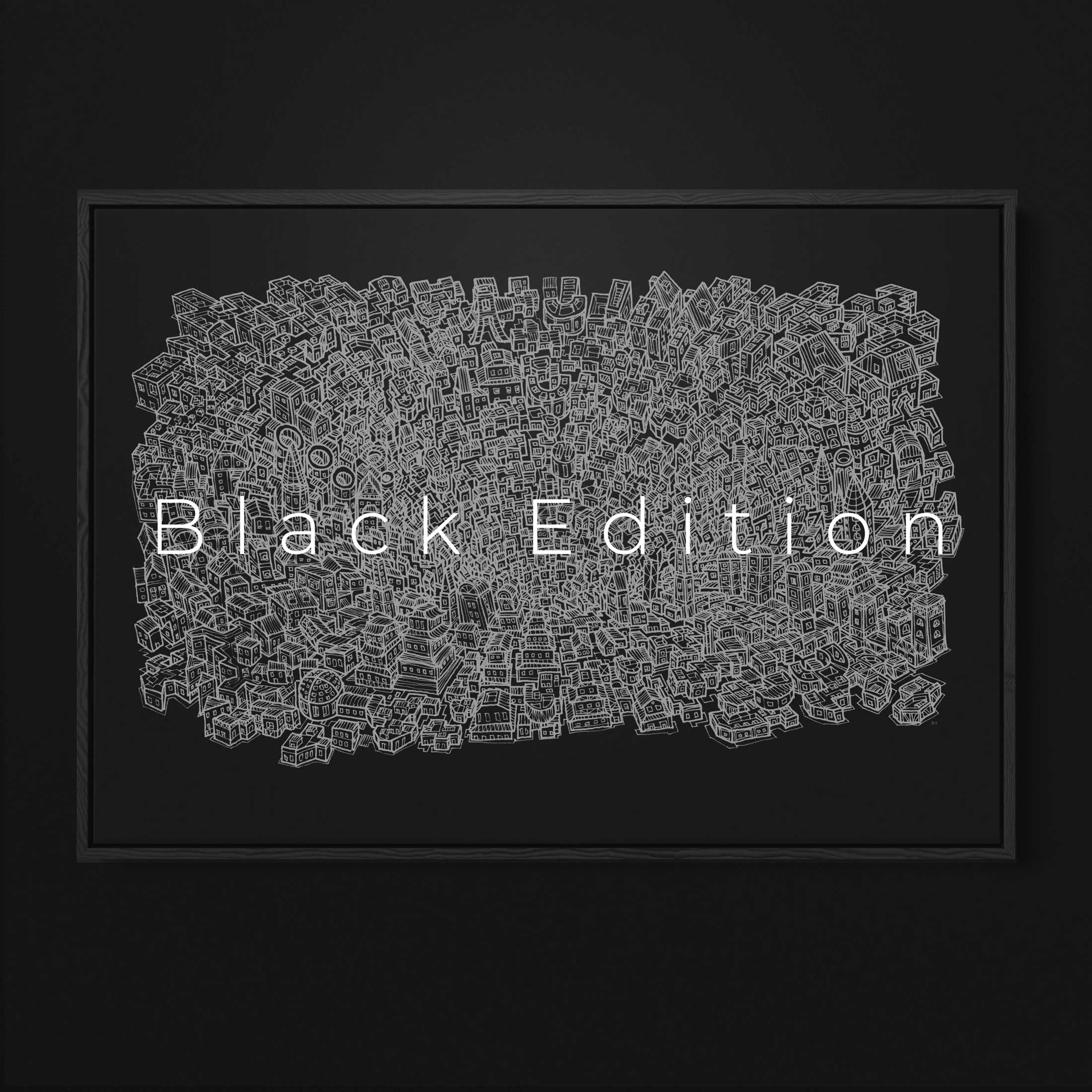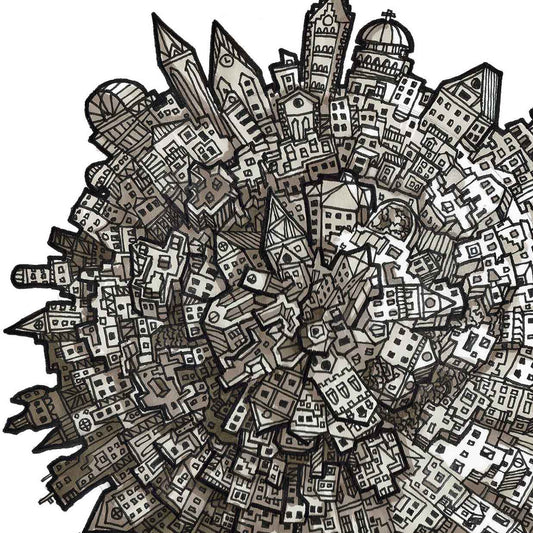 Every line, every building carries meaning. Created by hand in black ink.