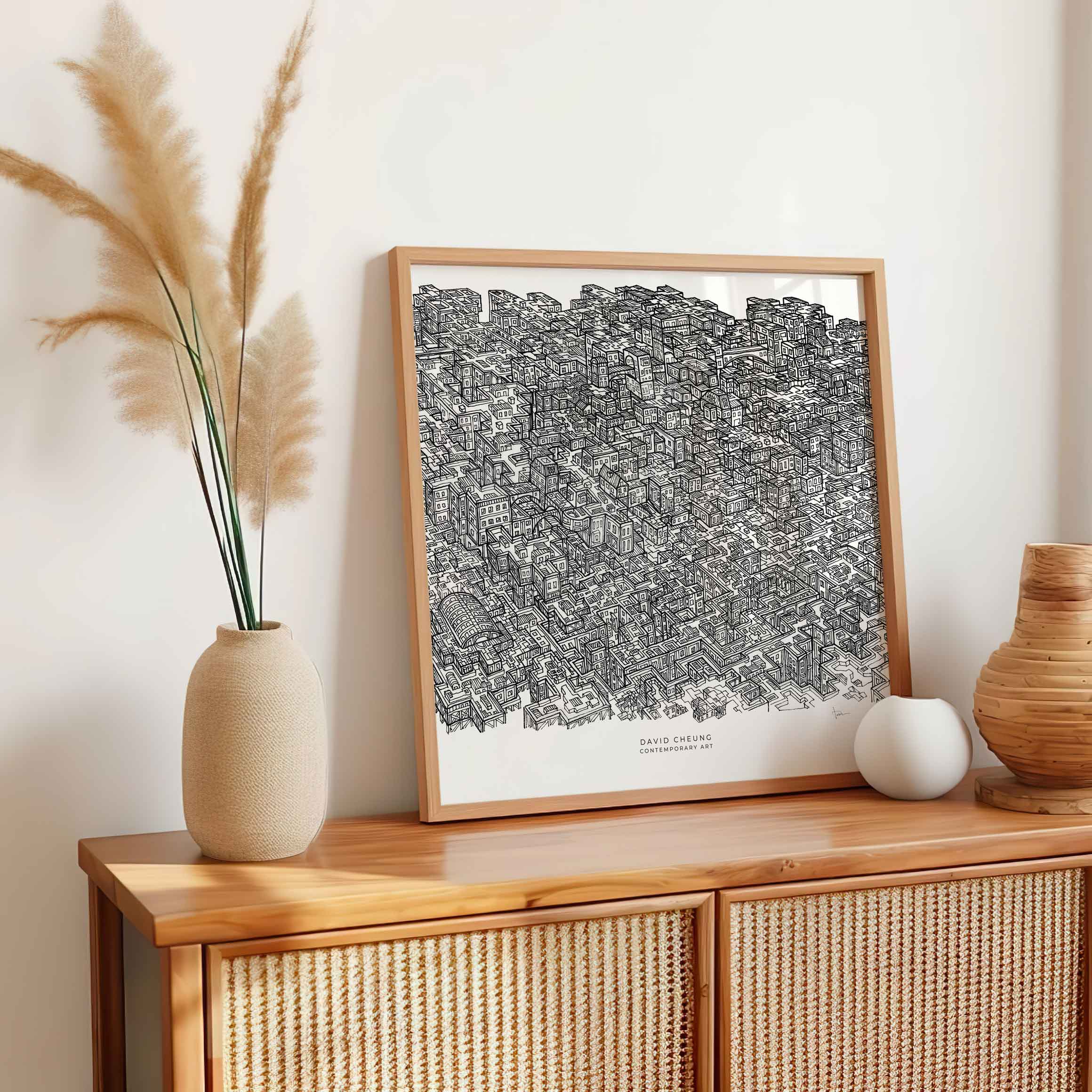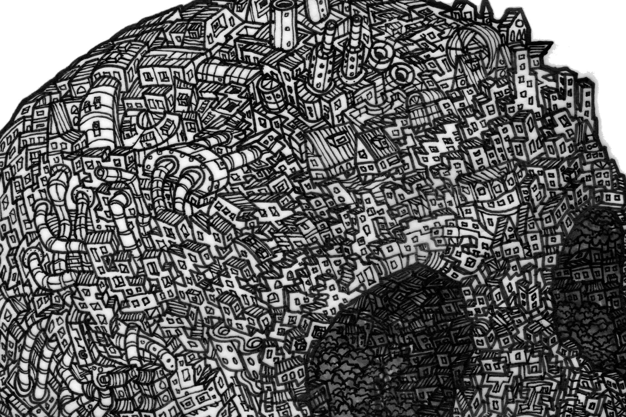 Varje linje, varje byggnad bär mening. Skapad för hand i svart bläck.