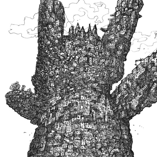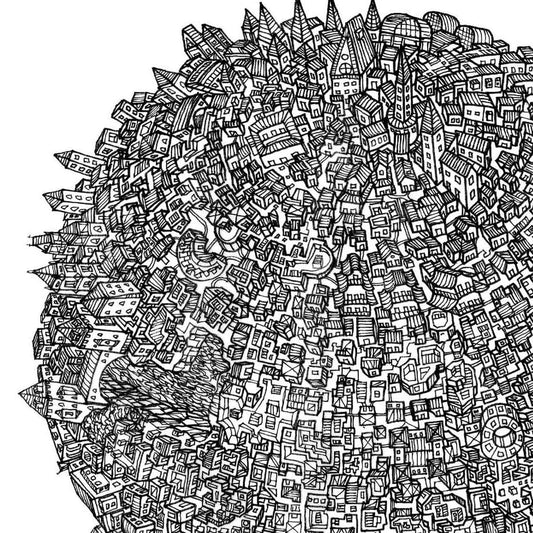 Through his detailed ink drawings, he creates entire worlds – cities, creatures and symbols – in a perfect balance between darkness and control.