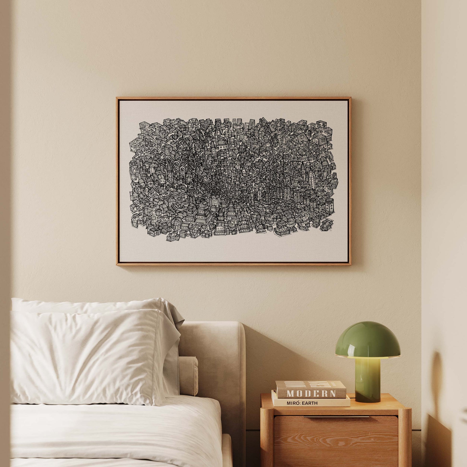 Hvert tryk leveres klar til ophængning med præinstalleret savtakbeslag og gummibumpere for at beskytte din væg og holde dit kunstværk perfekt justeret.
